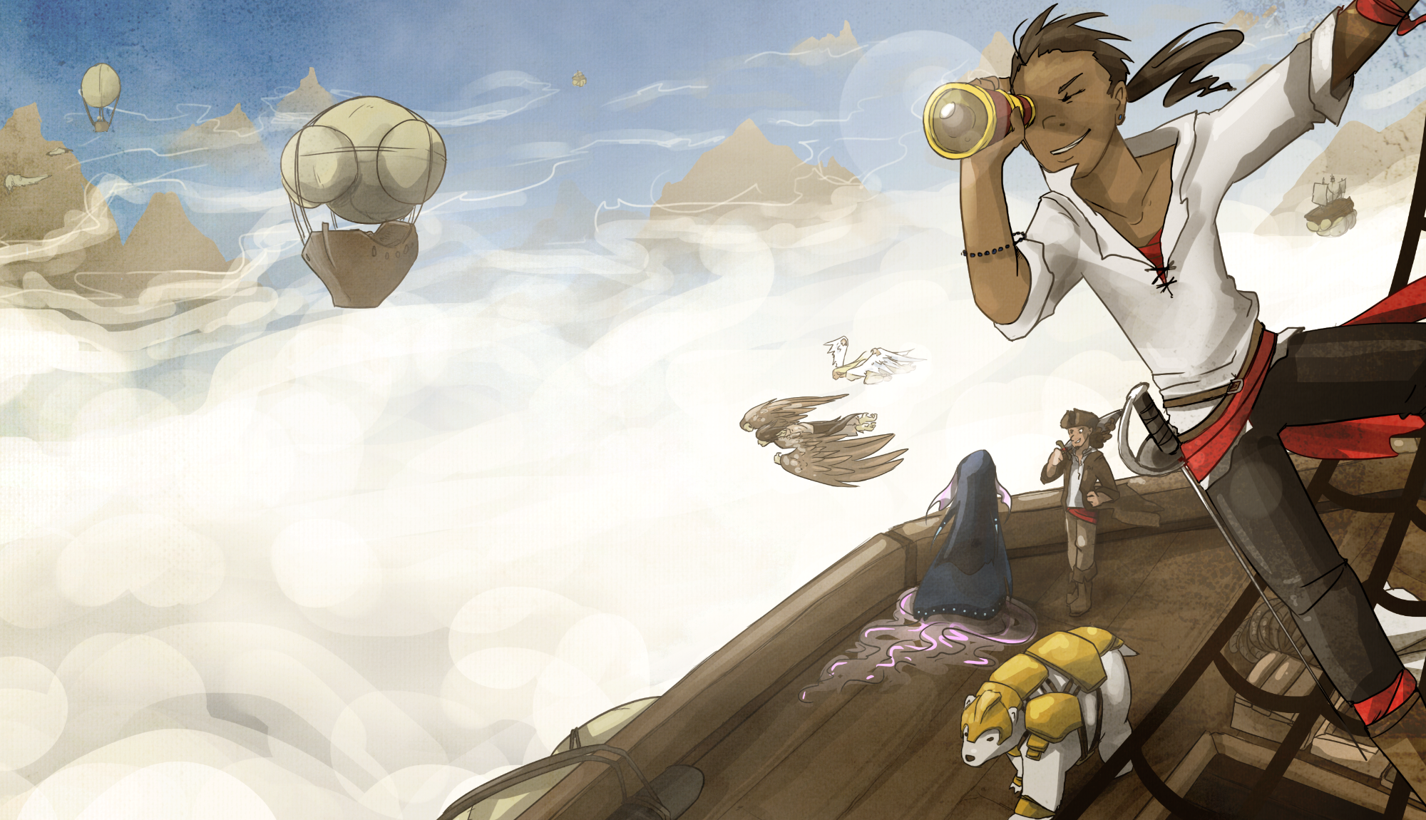 The dawn of exploration has come. The skies have cleared, and we are still here, still alive. Below us lies the sea of clouds, and impossibly below that, the long forgotten ground. Now it has fallen to us to strike out, by ship or balloon, to near and far, to explore the mountain spires that still hold life. There is life to be found, there is treasure and there is the legend, the telling of how our world came to be.